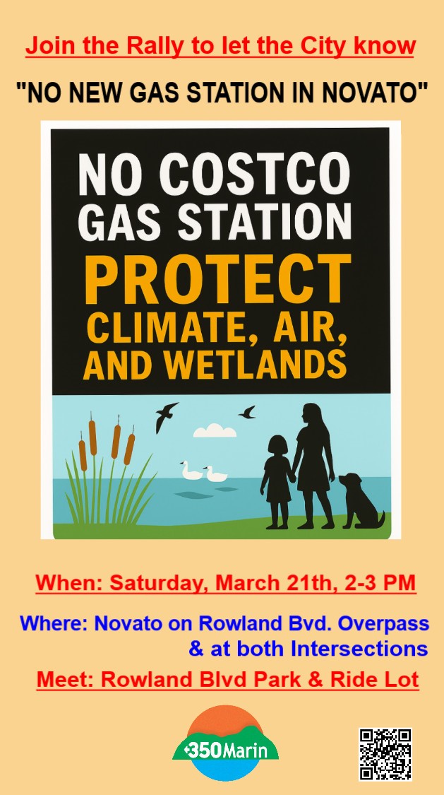 Stand with us to oppose the construction of a massive 28-pump gas station at the Novato Costco. This project threatens our local wetlands and contradicts our climate goals, so let’s show up in force at the Rowland Blvd. Park and Ride meeting point to demand a fossil-free future for Marin and protect our sensitive ecosystems from unnecessary expansion.